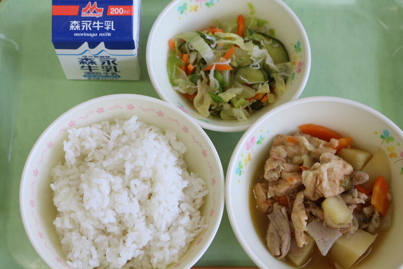 『麦ごはん・チキンカレールウ・にんじんサラダ・牛乳』です。
