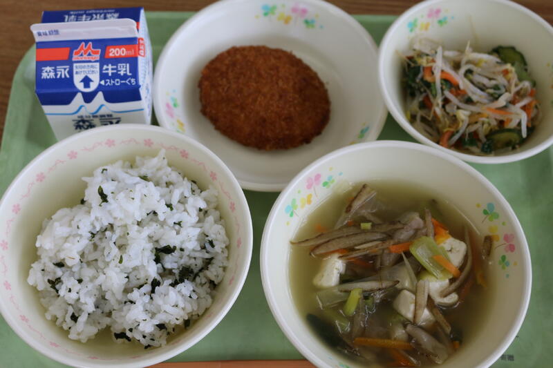 『わかめごはん・鶏ごぼうスープ・コロッケ・にらともやしのナムル・牛乳』です。