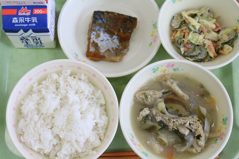 『麦ごはん・なすのみそ汁・さばのみぞれ煮・野菜の梅マヨ和え・牛乳』です。