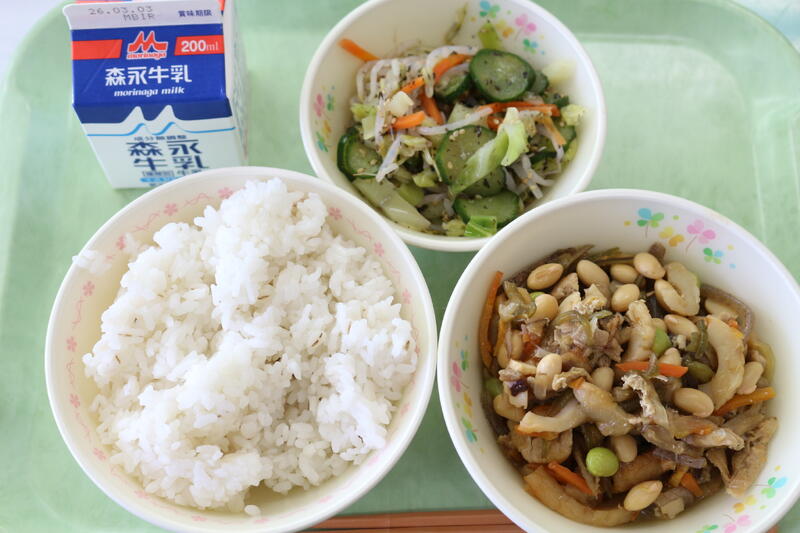『麦ごはん・大豆の磯煮・野菜のゆかり和え・牛乳』です。