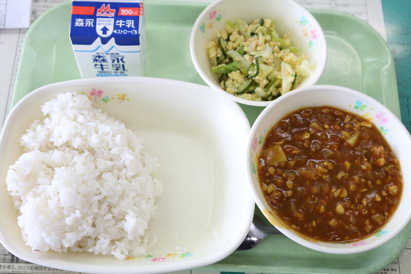 『麦ごはん・キーマカレールウ・グリーンエッグサラダ・牛乳』です。