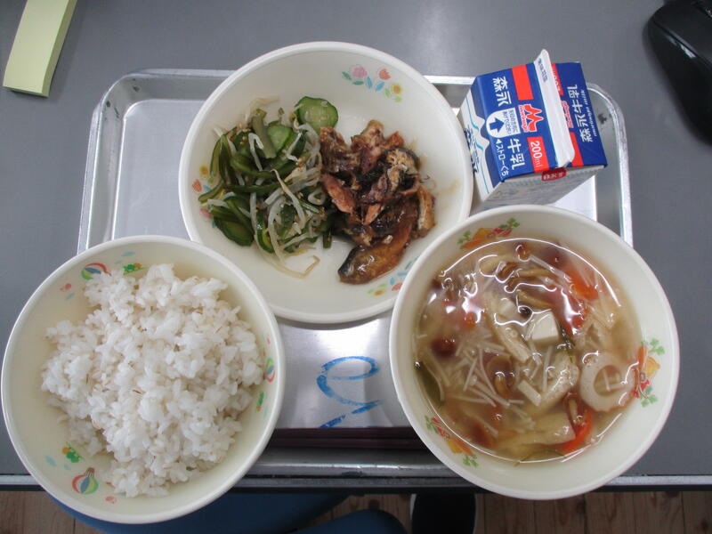 3月9日(月) 麦ごはん・牛乳・きのこ汁・いわしの梅煮・わかめのあえもの