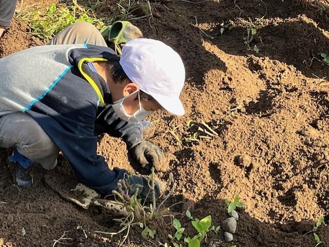 5月29日にさつまいもの苗を植えに行ってから5ヶ月半がたちました。松村農園(元築山小校長:松村誠一さん)に再びなかよし学級の子供たちが勢ぞろいして、収穫を楽しみました。