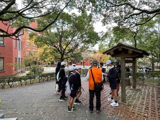 フィールドワークでは、平和公園周辺の各所をめぐりました。ボランティアガイドさんの説明を聞きながら、原爆落下中心地、平和公園、浦上天主堂、如己堂、山里小学校を訪ねました。