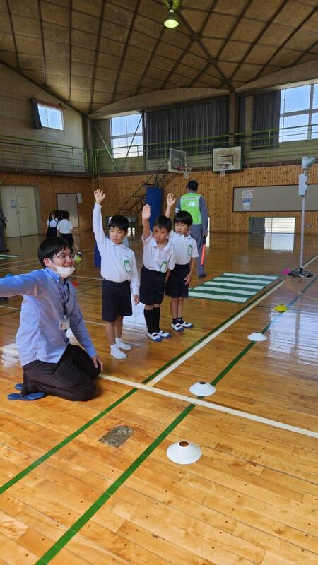 体育館で、1年生が交通教室を行いました。横断歩道の渡り方を中心に、安全確認の仕方など交通指導員や市役所の方から手ほどきを受けていました。