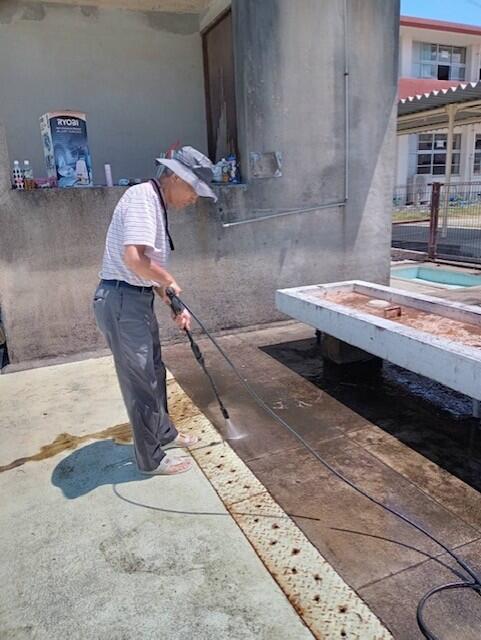 高圧洗浄機で細かい部分まできれいにしていただいたり、プールサイドの草を取っていただいたり…。