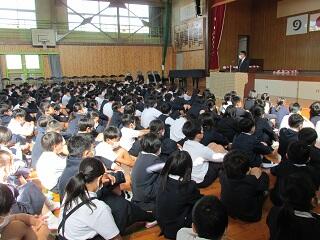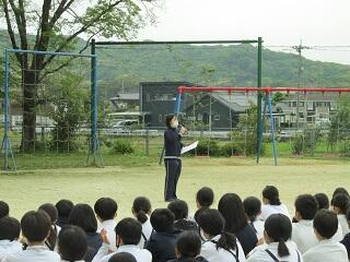 5月11日(木)学年集会を行いました。運動会が近づいているため、気持ちを切り替えるために先生方からお話がありました。テーマ「きついけど楽しい」のもと、みんな静かに前を向いて話を聞くことができました。