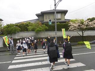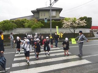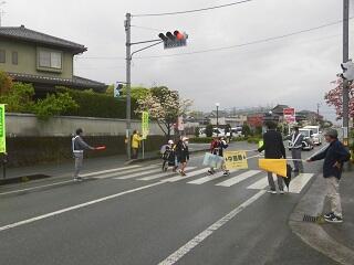 築山小学校では、3年前から正門と西門の前で教職員や地域の方たちの協力により挨拶運動及び交通指導を行っています。昨日は、玉名警察署の方、玉名防犯協会の方、玉名地区安全運転管理協議会の方、玉名地区交通安全協会の方たちも一緒に交通指導を行いました。