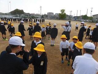 2校時に6年生主催による「1年生を迎える会」が運動場で行われました。築山小学校に登校し始めて一週間が経つ1年生にとって、6年生のお兄さんお姉さんと一緒に遊んぶすてきな時間となりました。