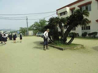 4月22日(土)には、授業参観が行われます。それに向けて学校の環境を整える際、地域の方の協力の下、中庭の草刈りをしていただきました。草刈りボランティアは、築山小学校で初めての取組です。