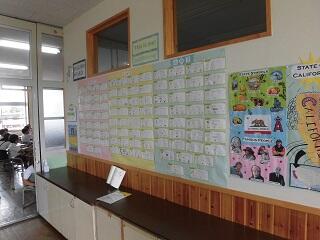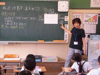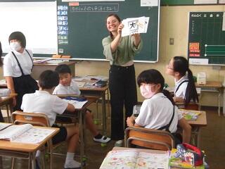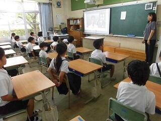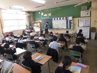 築山小学校では、中学年で外国語活動、高学年で外国語科の授業が行われています。今日の5時間目には木原英語専科とクリスティナ・ストライツ先生(ALT)が、教科に関する英語の表現をゲーム形式で覚える授業が行われていました。
