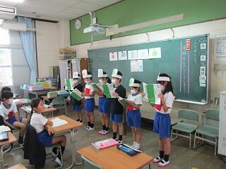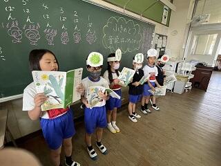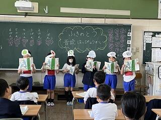 2年生は国語の単元「ふきのとう」で登場人物のお面をかぶりながら、音読発表会に行いました。登場人物の気持ちを考えながらみんな上手に発表できました。
