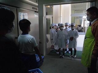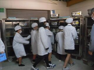 給食の時間になると、各学級の給食当番と担任の先生は給食室に給食を取りに来ます。26学級の給食当番がぶつからないように、移動の仕方を工夫しながら取り組んでいます。