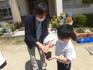 朝から園芸委員会の児童が、夏の花であるマリーゴールドをポットに植え替えました。種から育てたマリーゴールドなので、大切に芽を植え替えていました。