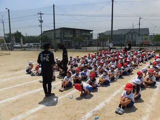 本日(5/22)、運動会の全体練習を運動場で行いました。開会式の流れや準備体操、三団ごとの応援団練習など全学年の児童が頑張っていました。