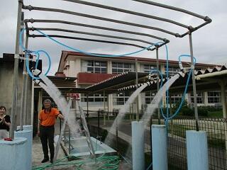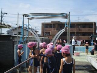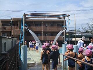 昨日、地域の方のアイディアとご協力の下、築山小学校のプールに手作りのシャワーが4つ取り付けられました。利用した子どもたちからは「気持ちがいい~。」「最高のシャワー。」など喜びの声が多くあがっていました。