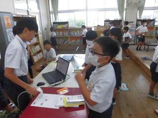 雨の日が続いているこの頃、昼休みに図書室に行くと多くの児童が本を借りています。低学年から高学年まで自分の好きな本を一生懸命探し、たくさん借りています。読む力を今こそしっかりつけましょう。