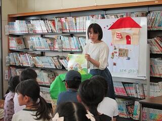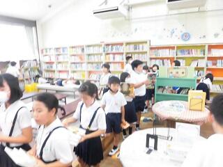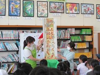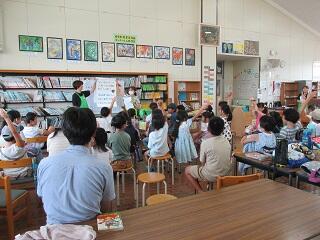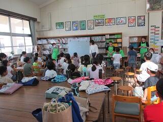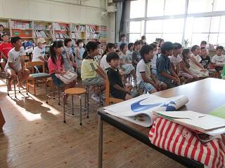 昨日の朝、図書室においてかっぱらっぱの会の皆様による「夏のおくりもの」が行われました。エプロンシアター、紙芝居、自然をテーマにしたクイズをしていただきました。子供や保護者を合わせて35人前後が参加して、大変盛り上がりました。