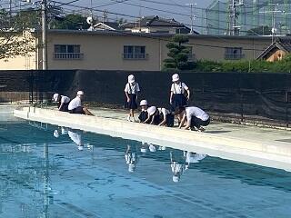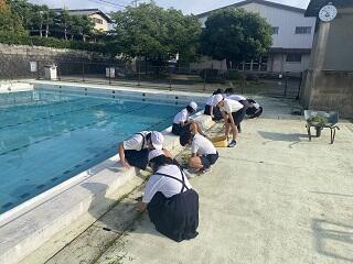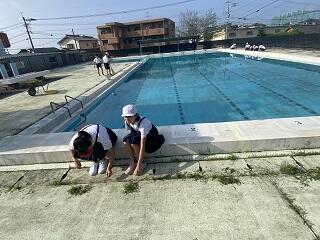 本日、朝から体育委員会の児童と5年生のボランティアがプールサイドに集まり、草取りをしてくれました。プールサイドの草が少なくなったことで、気持ちよく水泳の学習ができると思います。