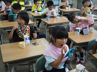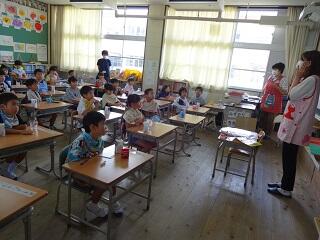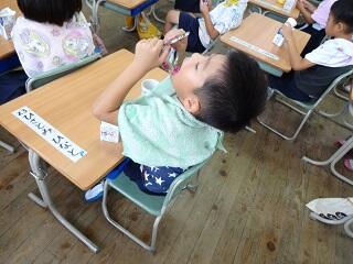 本日は、1年1・2組の児童に対して玉名市保健センターの方々が、正しい歯みがきの仕方を教えていただきました。鏡を持ち、みがき残しがないか確認しながらはぶらしを上手に使っていました。