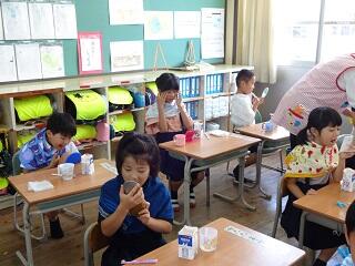 1年生では生活科の学習でシャボン玉づくりを行いました。紙を貼っていないうちわやトイレットペーパーの芯、太さの違うストローなどつかってきれいなシャボン玉をつくり大喜びでした。