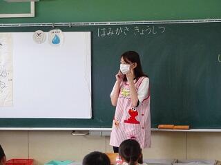 本日、1年3・4組で正しい歯みがきの仕方について、玉名市保健センターの方に指導していただきました。子どもたちは、虫歯にならないように正しい歯みがきがしっかり身につけるため真剣に歯みがきを学んでいました。
