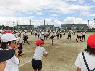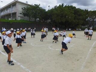本日、1年生の体育では1・2組が体育館で基本の運動、3・4組がプールで水あそびの学習を行っていました。それぞれの学級が、みんなで運動を楽しんでいました。