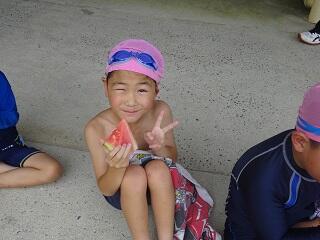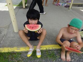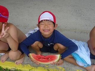 7月18日(火)になかよし1,2,3,4,5,6組合同で、スイカ割りをしました。初めて、なかよし畑でスイカを育てました。初めは大きく実るか不安でしたが、30㎝以上の大きなスイカがなっていました。スイカ割りをした後は、みんなでおしくいただき、プールを楽しみました。