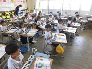 3年生になったらソプラノリコーダーの練習が音楽の時間に始まります。指遣いやリズムをそろえることは難しいですが、先生の指導に合わせながら演奏できていました。