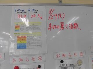 職員玄関前には暑さ指数(WBGT)計測器を設置し、適宜数値を確認しています。数値については職員室に掲示して全職員に周知を図るようにしています。