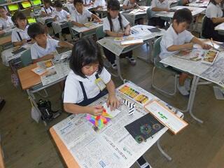 1年生では図工の時間に「ぬってけずってえをかこう」の学習を行いました。クレパスでいろんな模様を描き、それを黒い台紙に活用することできれいな花火や不思議な世界を上手に描いていました。