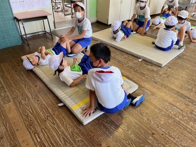 1年生教室前の広いろうかにマットが並び、1年生があおむけに寝ていました。6年生は、1年生の足首部分を押さえて、スポーツテスト「上体起こし」のサポートに取り組みました。