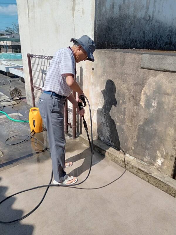 高圧洗浄機で細かい部分まできれいにしていただいたり、プールサイドの草を取っていただいたり…。