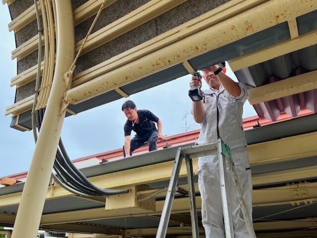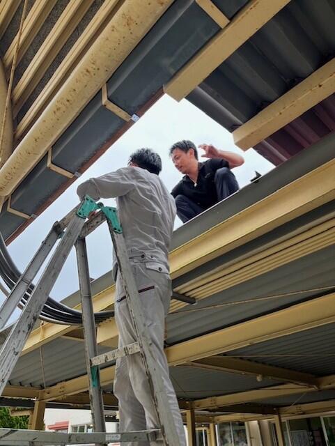 屋根の上に登って、状況を見ながら計測して作業開始!今日の夕方は、小雨が降りしきる中でしたが、有田会長さんと清田学校補助委委員長さんがてきぱきと作業を進められました。