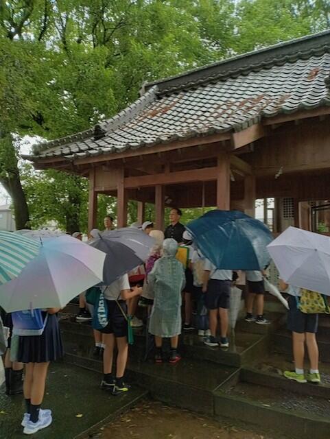 6年2組は山田神社に行ってきました。こちらも雨模様のため、部屋の中で説明を聞くことができました。