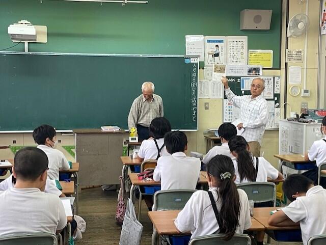 斗山さんたちが学校においでになり、教室で話をしていただけることになりました。築山小学校が当時あったこと、神社の歴史、どんな神様が祭られているのかなどなど…。