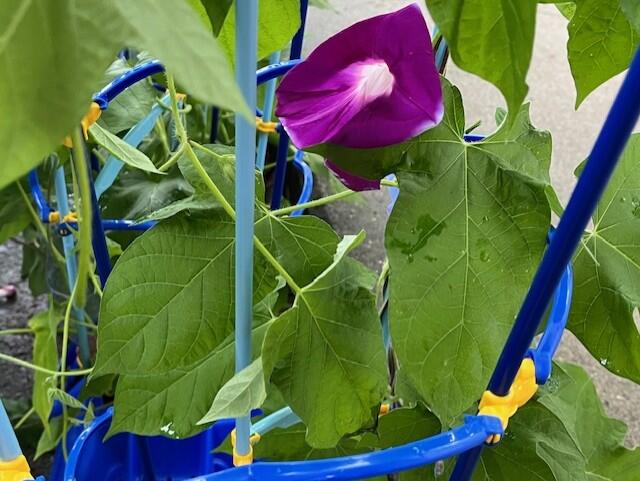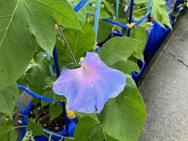 ついに1年生が育てているあさがおの花が開きました。雨に濡れていますが、みんな元気で大きな花をつけています。赤紫色、青紫色、ピンク色などの花がとてもきれいでした。