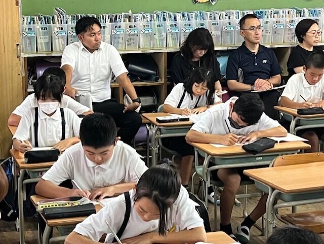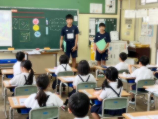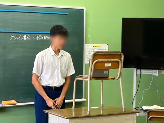 朝から、オンライン集会で中学生を紹介しました。ちょっぴり緊張気味でしたが、無事挨拶を終えると1年生の各教室に2名ずつ入りました。