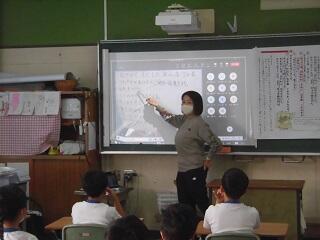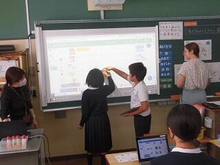本日、英語専科の木原先生による5年生の外国語の研究授業が行われました。ALTのクリスティナ・ストライツ先生と一緒に、「Where is the post office?」「Go straight.」「Turn left.」など各施設までの案内方法について学習していました。