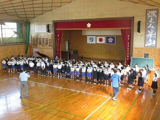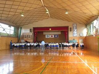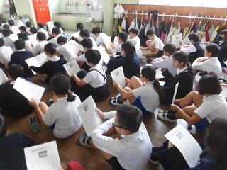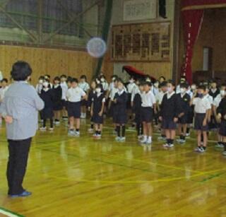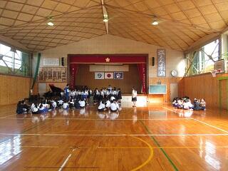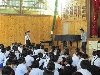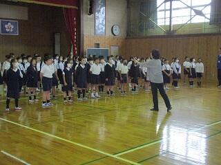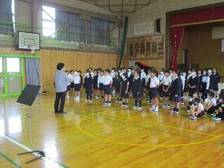 朝活動の時間に4年生は、1年生から3年生が見ている前で明日の音楽会で発表する合唱「ぼくの太陽」を発表しました。4年生の響きある二部合唱に、聞いていた下級生からも大きな拍手がでて、とてもよい発表会になりました。