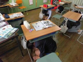 先週の金曜日午前9時45分から「熊本シェイクアウト訓練」を実施しました。1年生から6年生まで訓練により防災意識を高め、災害から身を守る方法を学びました。地震時には机の下で身を隠すことを体験しました。