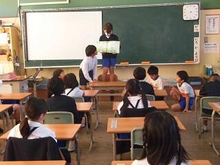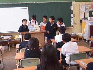 朝活動の時間に3年生が1年生教室に来て、絵本の読み聞かせを行いました。3年生は国語「班で意見をまとめよう」の学習で、1年生への読み書かせの内容や時間等について話し合い、実施につながりました。1年生も楽しそうな表情で、読み聞かせを聞いていました。