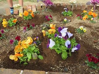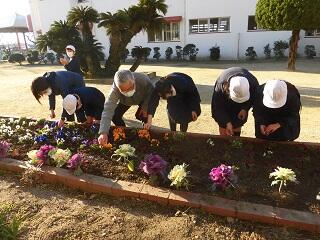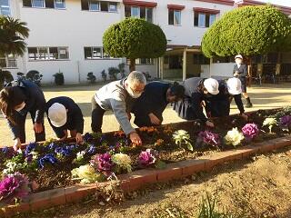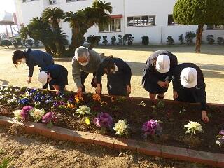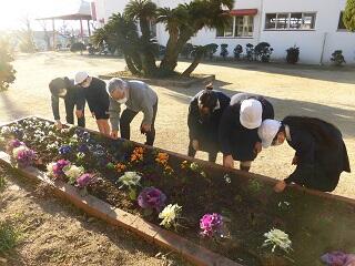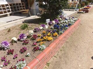 地域の方からいただいたパンジーを、3年生が協力してふれあい広場(正門の横側)に植えました。広場が明るくなり、綺麗な広場になりました。