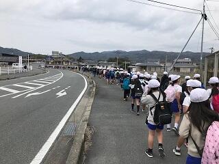 2校時に1・2年生が、持久走の授業を行っていました。晴天で汗ばむような天気のもとみんな元気よく取り組んでいました。2段目が1年生、3段目が2年生のスタート直後の様子です。