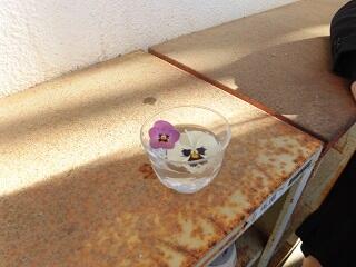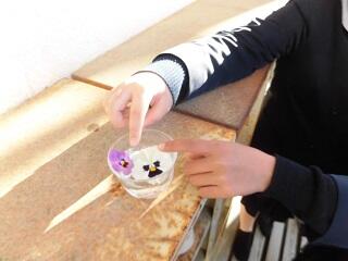 朝から花壇のパンジーやビオラの花の芽摘みをしてくれる児童がいます。摘んだ花を水中花にして飾ってくれました。