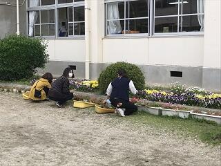 築山小学校では、校門の前に大きな花壇があります。今日、3年生が、その花壇の草をとって耕し、マリーゴールドを植えました。3年生の皆さんありがとうございました。