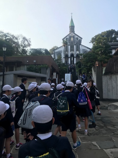 <フィールドワーク>グループ毎にボランティアガイドさんについて、如己堂や爆心地などで学習していました。