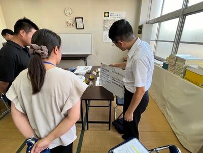 先生方は、一人一人真剣な表情で心臓マッサージ(胸骨圧迫)に取り組み、AEDの貼り方や操作の仕方を学びました。