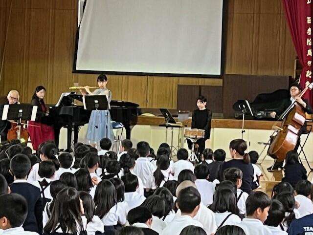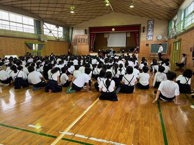 2時間目に1~3年生、3時間目に4~6年生が体育館に集まり、ラデツキー行進曲・アイネクライネナハトムジーク・踊る子猫・シンコーディッドクロックなどの生演奏を聴くことができました。
