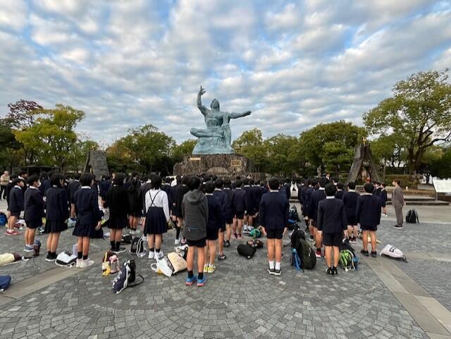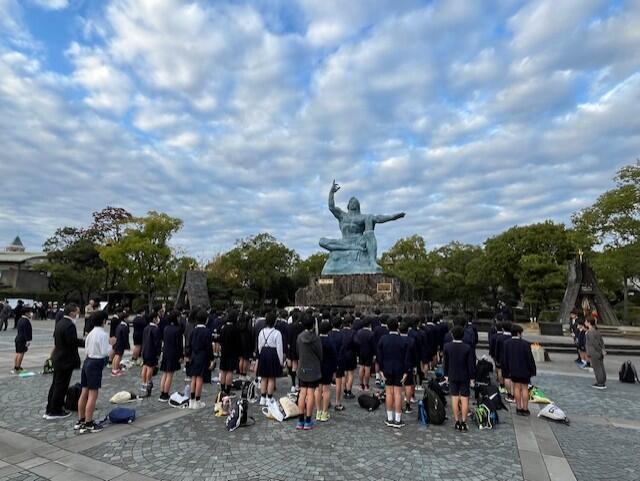 フィールドワークを終えた後は、全員が平和祈念像の前に集合して「平和集会」を行いました。外国人観光客の方も見守る前で、平和への誓いや「青い空は」の歌を折り鶴に添えて捧げました。